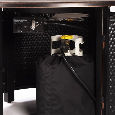 Whether your outdoor retreat is located in the mountains, on the coast, or somewhere in between, this fire table set will extend your evenings with friends and family around the fire. With this addition you can enhance your outdoor setting with even more ambiance and relaxation. This fire table set comes with an Outdoor Aluminum 44 in. Round Fire Table Set with Four Deep Seating Swivel Rocking Chairs, Fire Beads, Lid, Propane Tank Cover and Table Fabric Cover. The dimensions for the fire table are: 44″ L x 44″ W x 24.5″ H, 71.5 lbs. Each chair dimensions are: 28.3″ L x 33.8″ W x 34.2″ H, 27.3 lbs. The chair seat is 12.6″ H from the seat to the floor.
