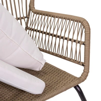 Our 3 Pieces Outdoor Wicker Bistro Set from Barton is designed for both modern style & lasting comfort. Set includes a glass-top wicker side table and two comfortable chairs with extra thick, weather-resistant cushions. Its elegant and contemporary design creates the ideal outdoor dining experience for your patio, garden, or pool area. Made with ergonomics and elegant style in mind, this wicker bistro set features curved armrests and curved seat backrests for relaxing leisure time. The perfect patio dining set for outdoor relaxation and gatherings for family and friends
