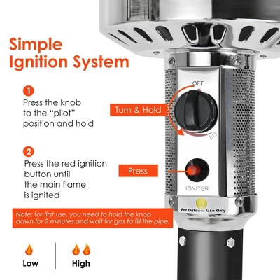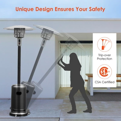 - Safety Protection: This outdoor heater adopts an anti-toppling design to turn the heater off automatically if it tips over by accident, and the patio heater with CSA certification makes you feel relieved to use it. Besides, 3 stakes increase overall stability and safety.