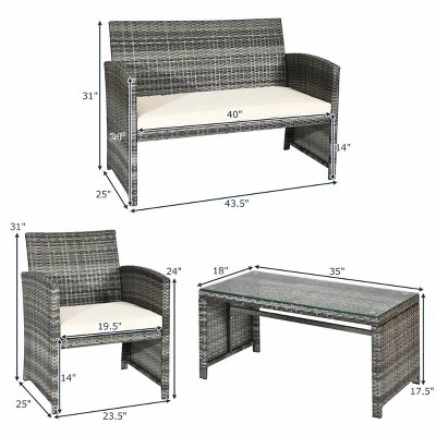 4 Piece Cushioned Patio Set, Which Are Of Contemporary Looks And Flavor, Offers Comfortable And Exceptionally Stunning Outdoor Lounging . What is More The Table Features A Tempered Glass Top.It Is Perfect For The Pool Side, Deck Or Patio, These Cushioned Seats Will Let You And Your Guests To Sit Back, Relax And Enjoy The Great Outdoors.