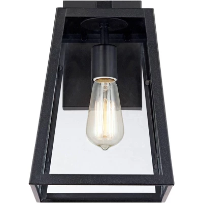 Brighten up your home’s exterior with this handsome set of four outdoor wall lights from the Arrington collection by John Timberland. This updated industrial design comes in a tapering black frame with a sleek, straight-lined look. Clear glass panels offer a full view of the beautiful vintage Edison style bulb that is included with purchase. Wet location outdoor rated. Vertical installation and wall mount only.