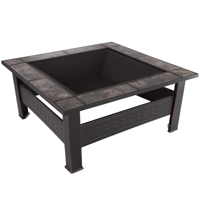 - Accented with an edge of black and orange tile with a marble look, this fire pit is sure to enhance your outdoor space